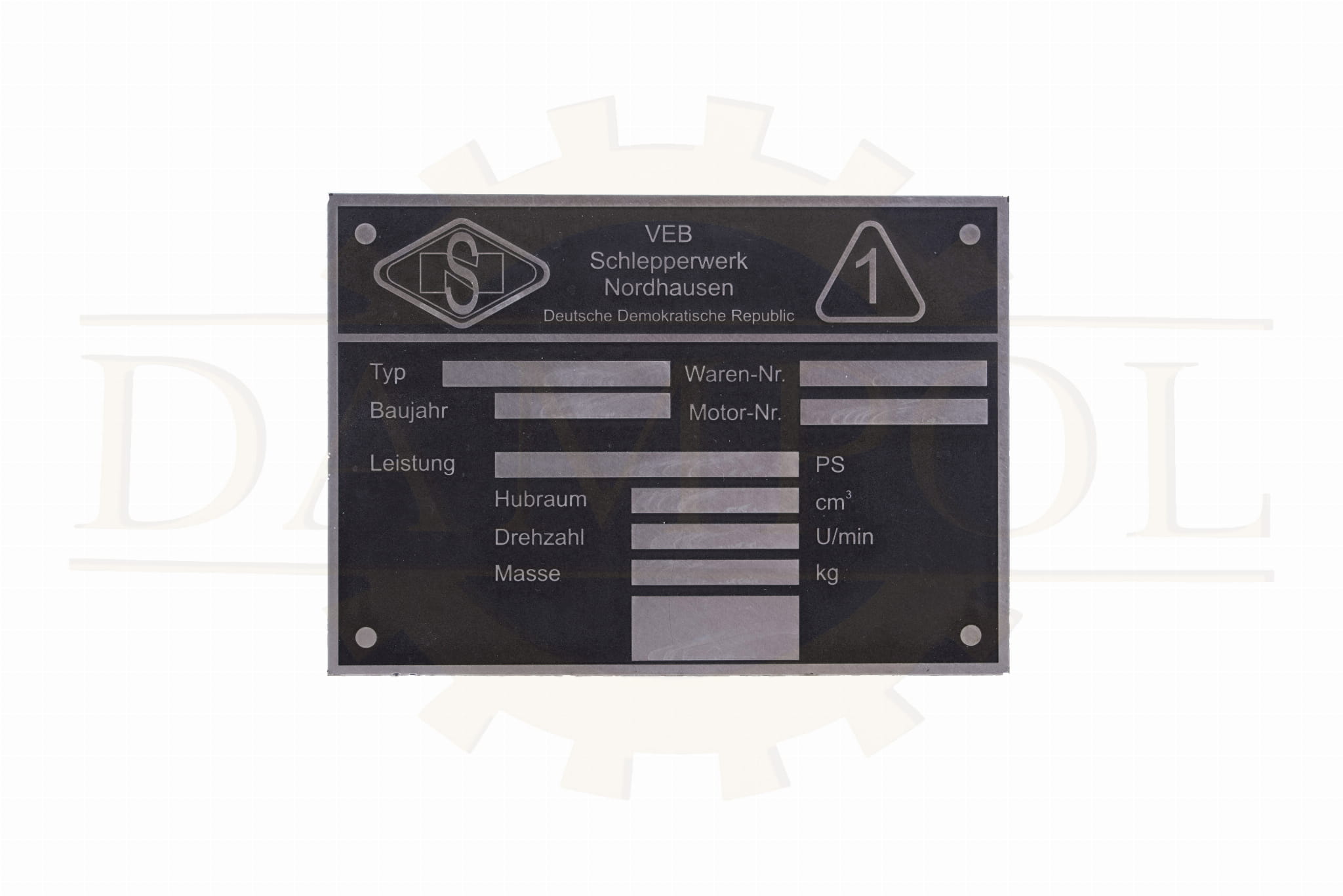 N° 78 - Plaque signalétique VEB Schlepperwerk Nordhausen (Usine de tracteurs de Nordhausen), aluminium gravé en profondeur, RDA