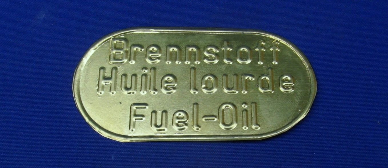 N° 12 - Panneaux de réservoir, étiquette de réservoir "Brennstoff" « Carburant » en relief pour Lanz Ursus Pampa, en laiton