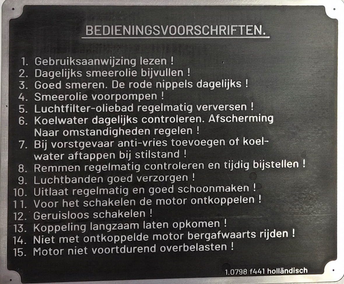 N° 153 - Panneau «BEDIENINGSVOORSCHRIFTEN», Lanz Bulldog, aluminium, gravé